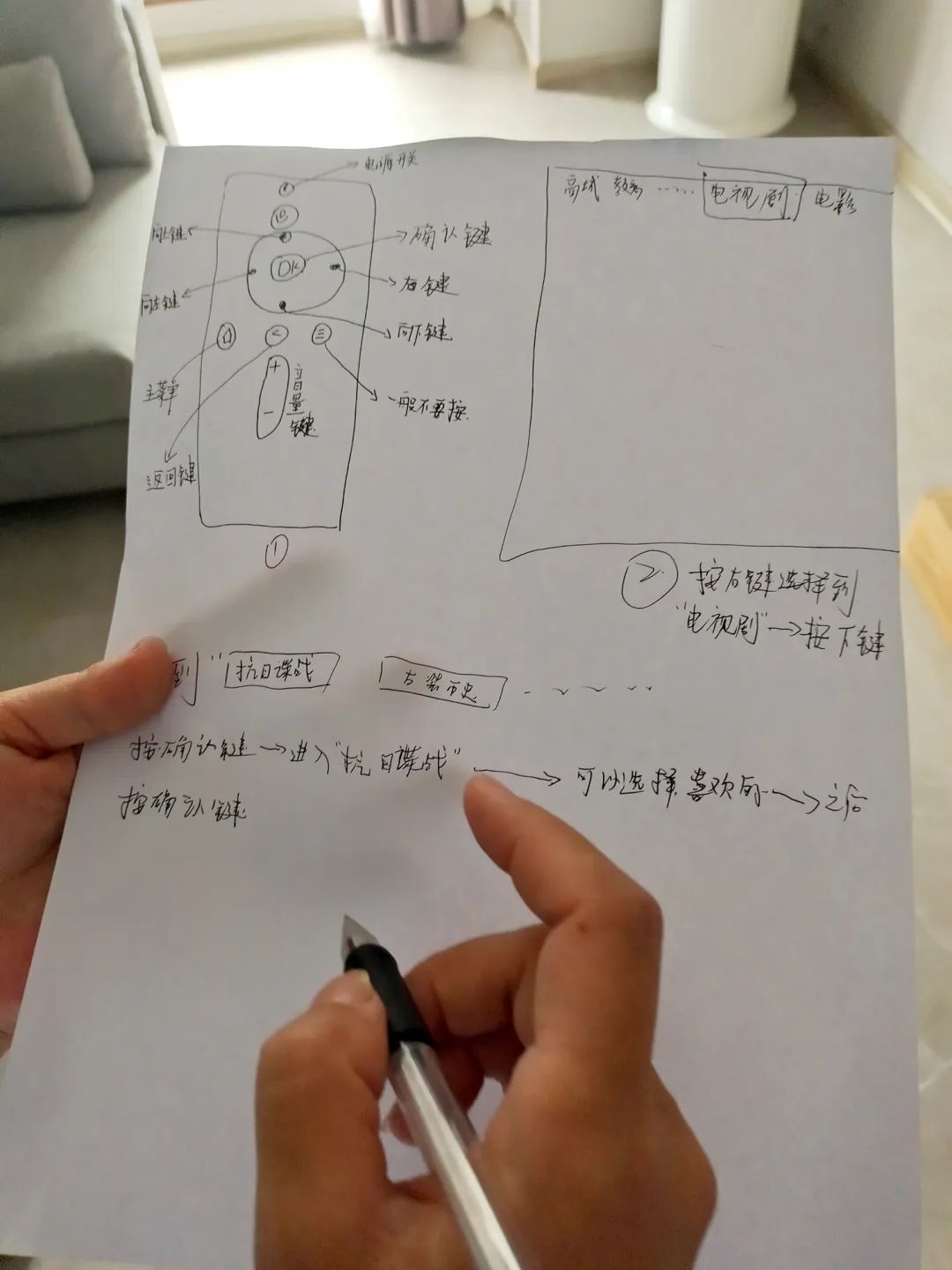 老人年紀(jì)大了,記性不好,總會忘記怎樣使用電視遙控器。楊瑾婷一遍又一遍地教老人使用遙控器控制電視,還手繪了遙控器使用示意圖,標(biāo)注好每個按鍵的功能。