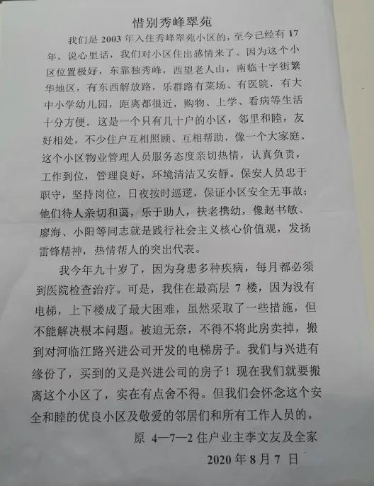 在搬離秀峰翠苑時(shí),他曾寫下惜別秀峰翠苑的一篇文章,對秀峰翠苑的環(huán)境、配套、和睦社區(qū)、貼心物業(yè)贊不絕口。雖然搬離秀峰翠苑,但是老人和興進(jìn)的緣分還在繼續(xù),新居銀桂府沒有讓老人失望,開篇我們所看到的就是老人對新居銀桂府的一切有感而發(fā)和高度贊揚(yáng)。