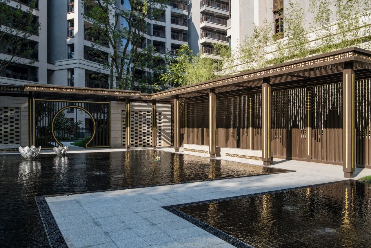 江山樾主打新中式風(fēng)格,以金色為主基調(diào),采用了王府的規(guī)制,將廡殿頂作為屋頂結(jié)構(gòu),并大量使用云紋、回形紋、山形紋等中式符號。