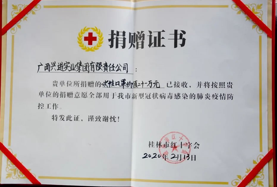 2020年,疫情肆虐的一年,興進(jìn)集團(tuán)第一時(shí)間啟動(dòng)應(yīng)急捐贈(zèng),向武漢市江夏區(qū)紅十字會(huì)、桂林市第二人民醫(yī)院、自治區(qū)南溪山醫(yī)院、桂林市紅十字會(huì)等15家抗疫一線單位,捐助抗疫善款及醫(yī)療物資,總金額超168萬(wàn)元,用鐵肩擔(dān)當(dāng)、愛心善舉助力疫情防控。