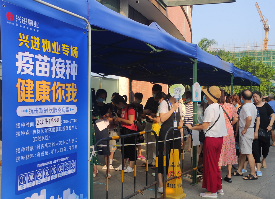 為了保證更多的業(yè)主和員工能及時(shí)安全地接種疫苗,興進(jìn)服務(wù)集團(tuán)立即發(fā)出指示要求各項(xiàng)目統(tǒng)計(jì)接種疫苗人數(shù),與防疫部門對(duì)接,開展疫苗接種專場(chǎng)活動(dòng),這也是桂林本土第一家物業(yè)申請(qǐng)開展的疫苗接種專場(chǎng),深受業(yè)主與員工的肯定。