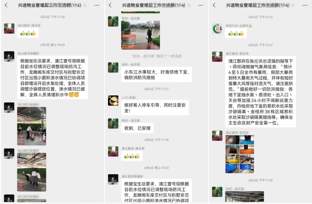 小區(qū)時(shí)刻監(jiān)控市政路面及車庫(kù)積水情況,若有內(nèi)澇風(fēng)險(xiǎn)提前聯(lián)系業(yè)主挪車,并做好了使用拖車為在外業(yè)主挪車的準(zhǔn)備。巡查過(guò)程中發(fā)現(xiàn)某業(yè)主凌晨在外工作,家中車輛不能及時(shí)挪動(dòng),物業(yè)人員了解到情況后,4點(diǎn)冒著大雨驅(qū)車前往業(yè)主辦公單位拿車鑰匙,為業(yè)主愛車挪至安全區(qū)域,這一舉措獲得了興進(jìn)業(yè)主一致認(rèn)可,最終確保了小區(qū)車輛0損失,0泡水。