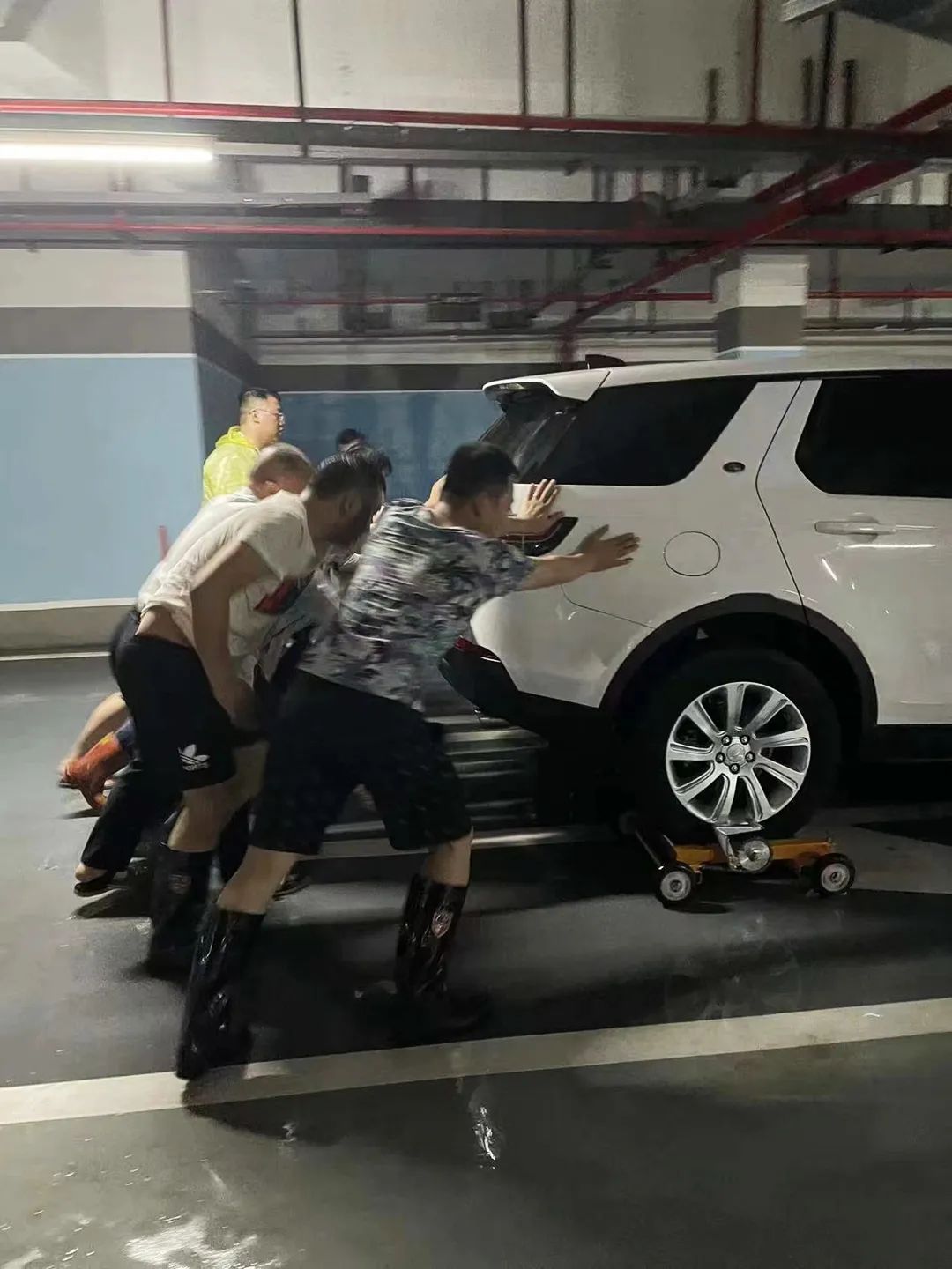 面對即將到來的汛情,物業(yè)人員第一時間拉起了警戒線,引導(dǎo)業(yè)主車輛進出。眼見著水位越來越深,雨越下越大,全員集體行動,協(xié)助車主移車。有的車主聯(lián)系不上,物業(yè)團隊便果斷冒雨采用移車器移車,從下午一直忙碌到晚上九點多,成功將所有車輛轉(zhuǎn)移至安全區(qū)域,力保業(yè)主們的愛車不受損失。