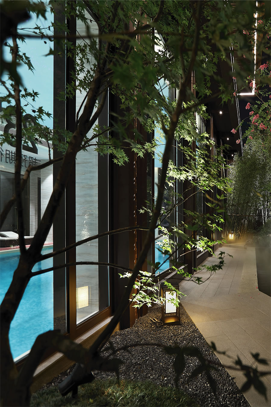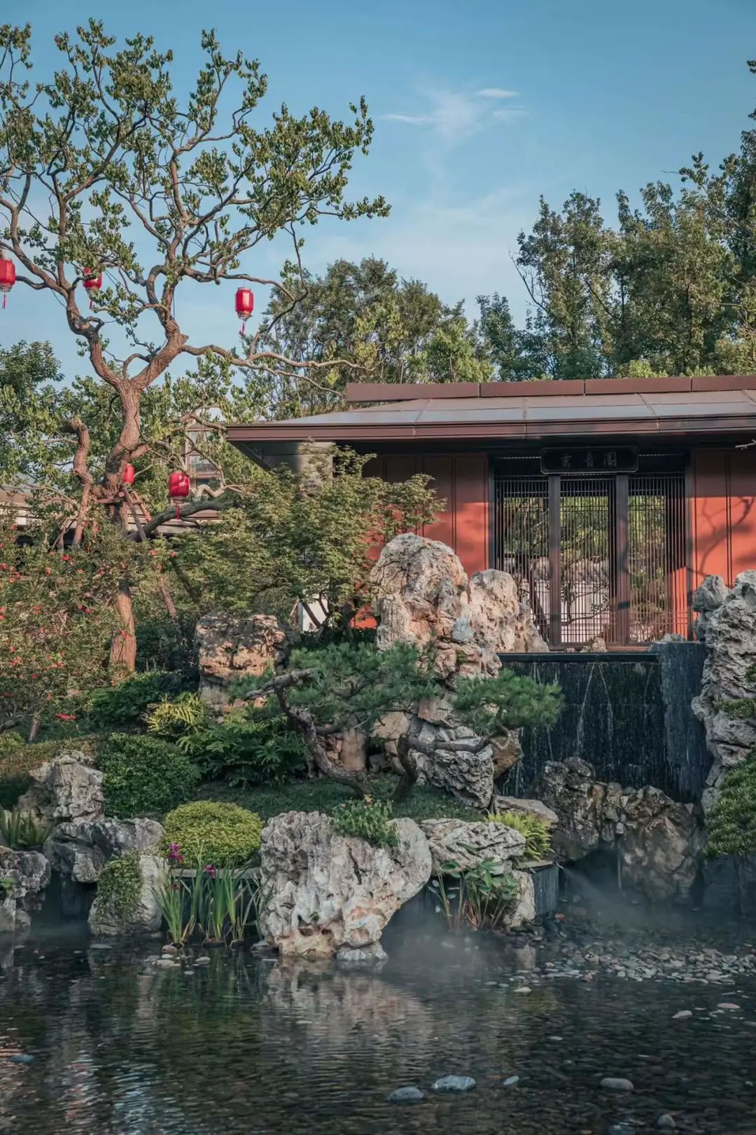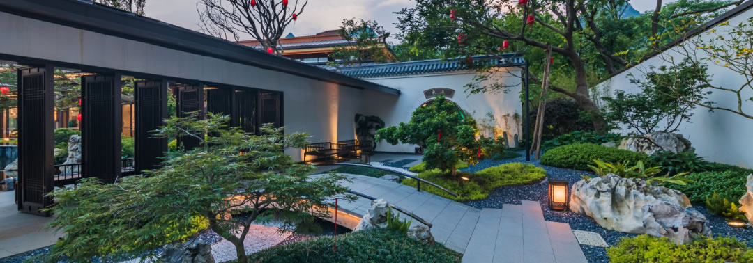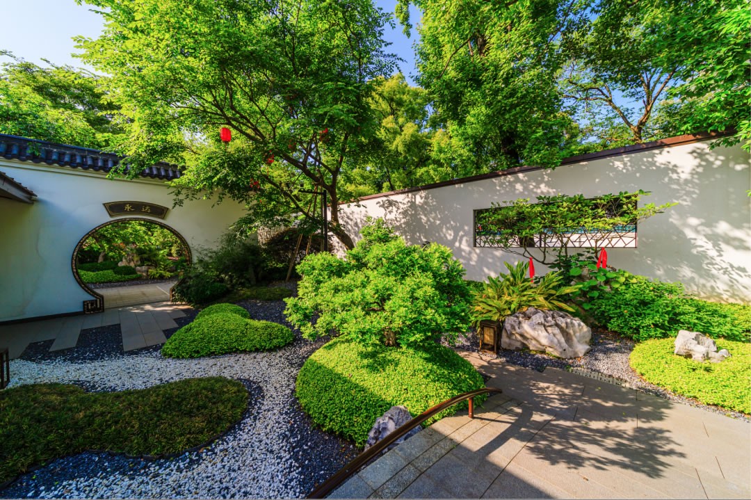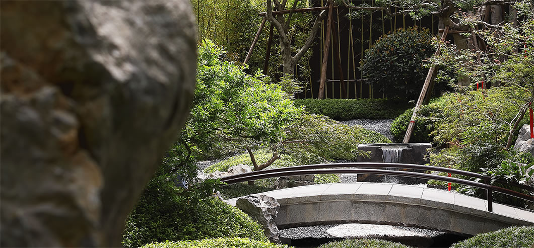 園林設(shè)計在傳承中國蘇州園林經(jīng)典和嚴肅規(guī)制的同時日本枯山水意境、精心考究照壁、水池、亭臺等元素,做到動靜相合、高地相輔、遠近融通。