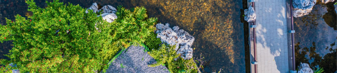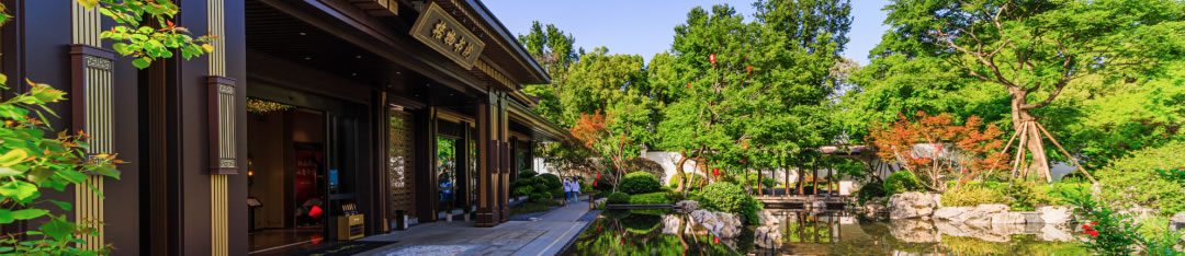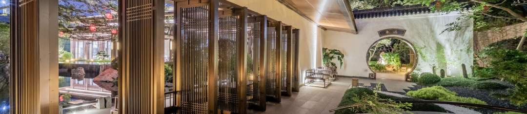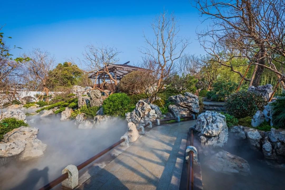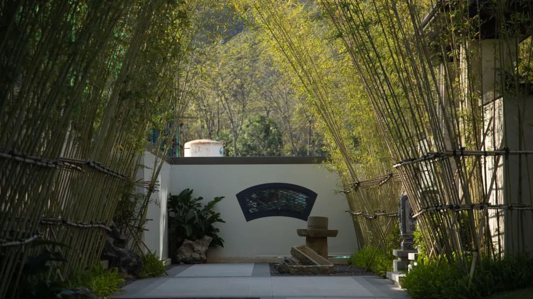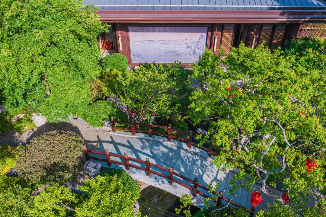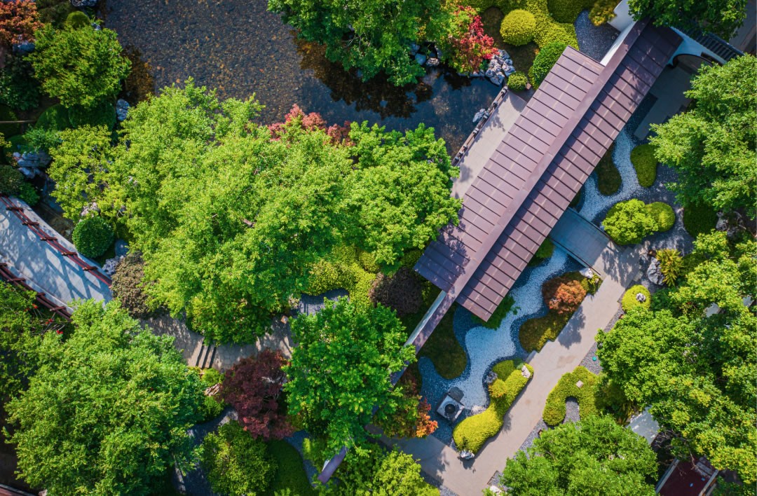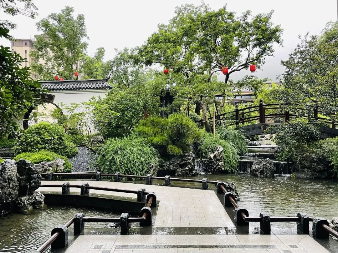 園林設(shè)計在傳承中國蘇州園林經(jīng)典和嚴肅規(guī)制的同時日本枯山水意境、精心考究照壁、水池、亭臺等元素,做到動靜相合、高地相輔、遠近融通。