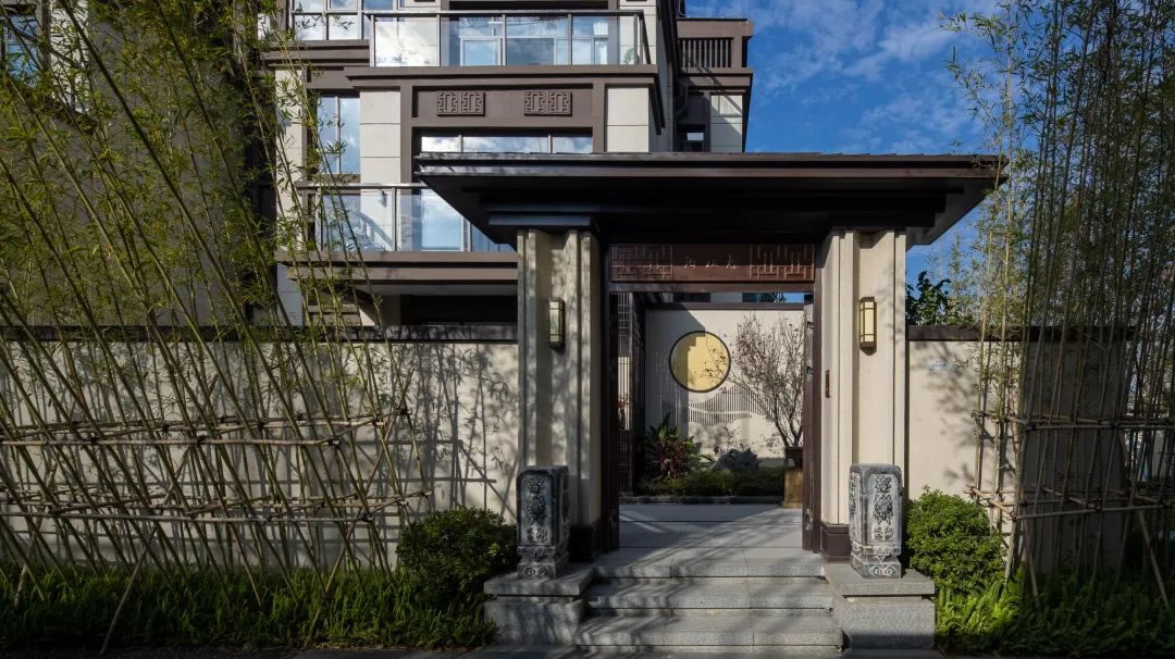 威嚴的石獅門當,山行紋理的戶對,以古蘇州園林建筑形態(tài)為藍本的大門,通過若水紋繪,講述一道中國家門的優(yōu)雅敘事。