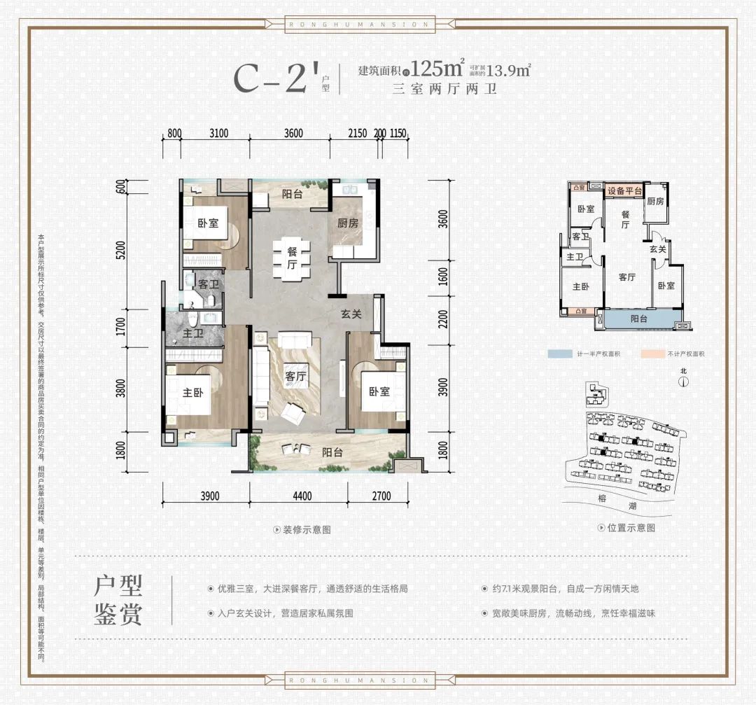 約5.5-9米闊景陽臺,大戶型三陽臺設(shè)計(jì),南北通透,讓榕湖美景與美學(xué)園林盡收眼底